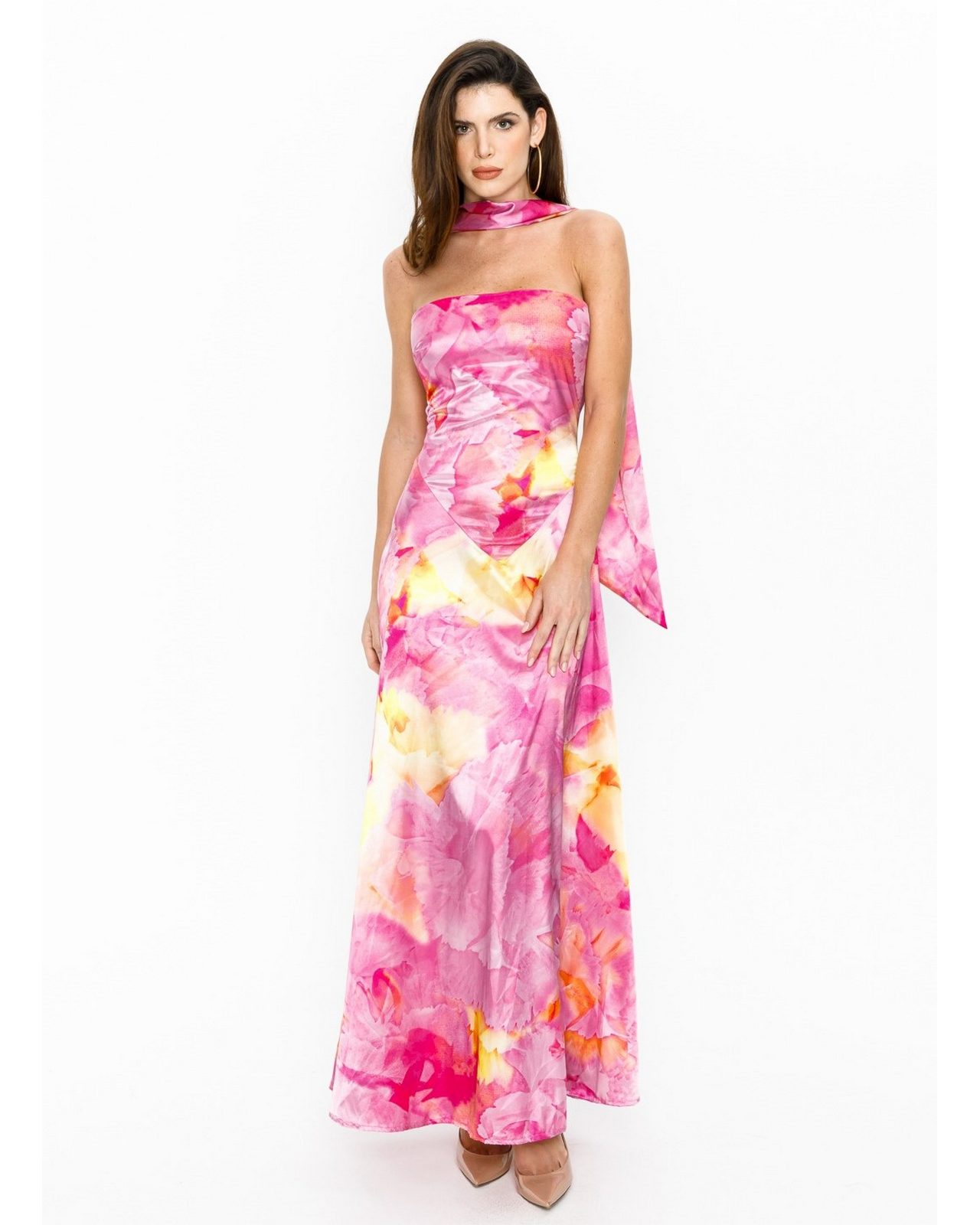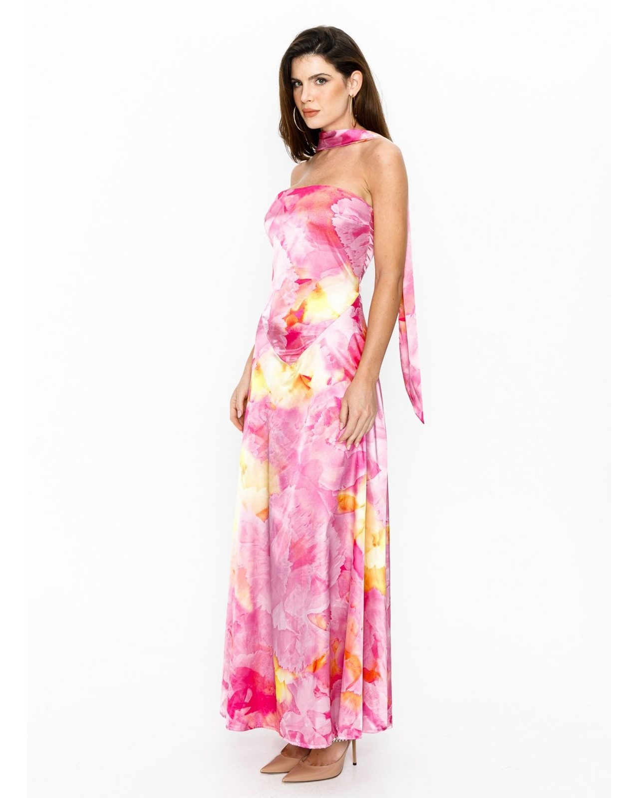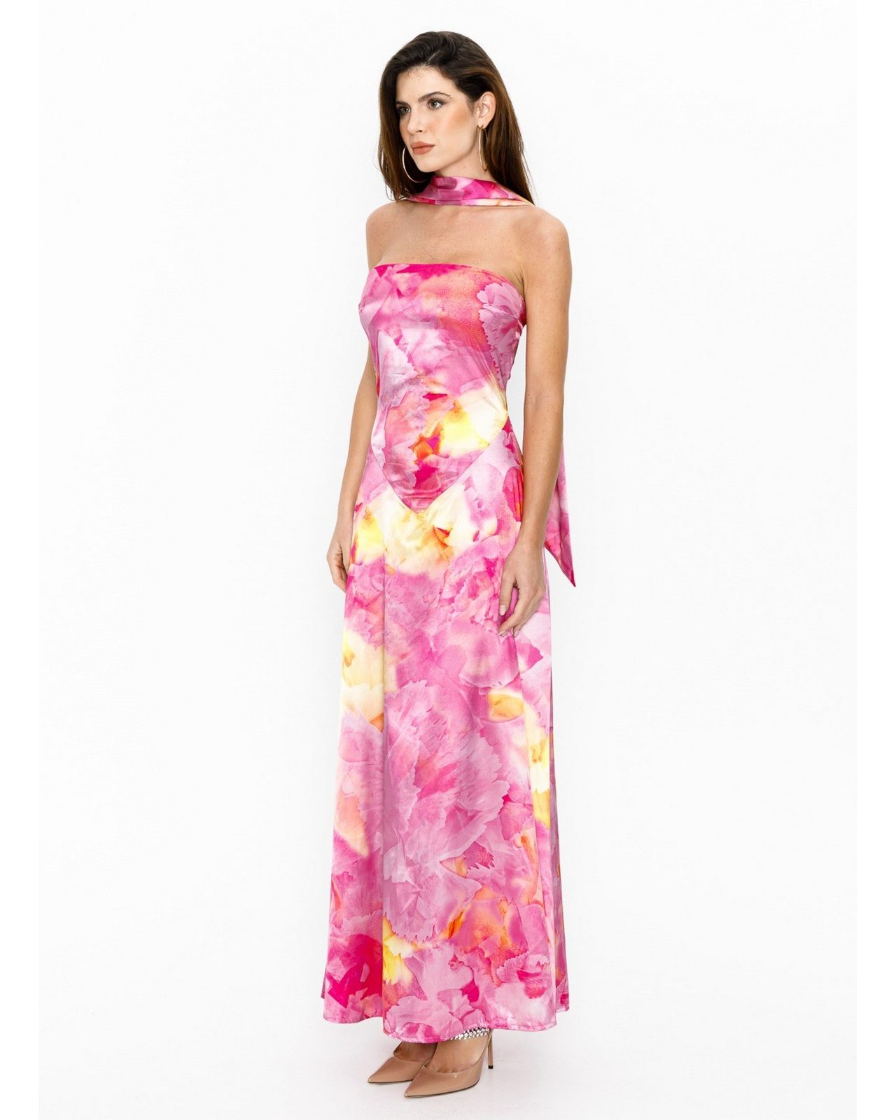 Belle μακρύ σατινέ φλοράλ φόρεμα strapless με στενή εσάρπα-φουλάρι στο λαιμό.