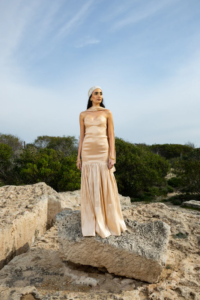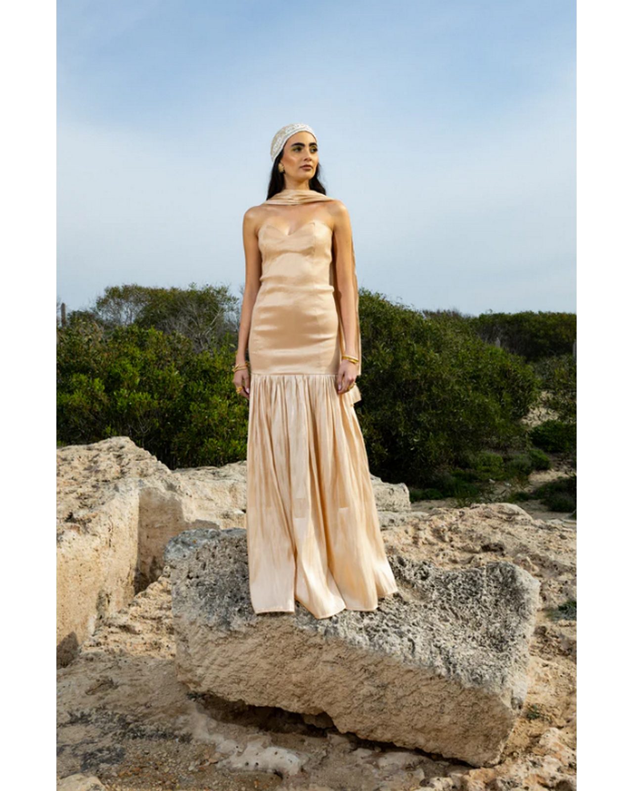Μακρύ φόρεμα σε χρώμα μπέζ χρυσό τής άμμου ,κατασκευασμένο από πολυτελές σατέν πού λαμπυρίζει με κάθε κίνηση.