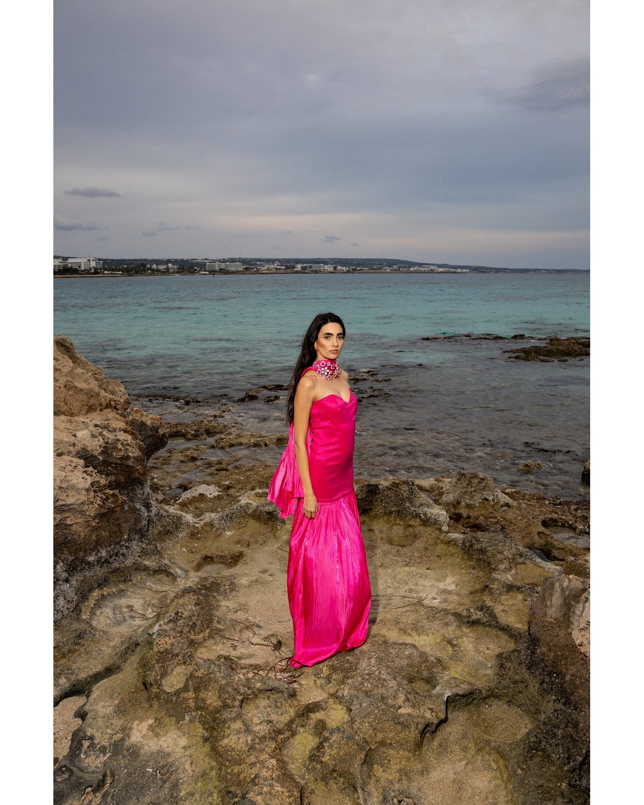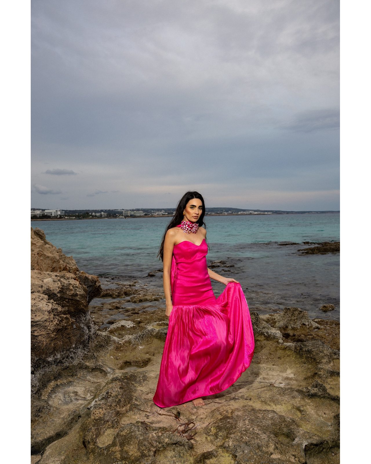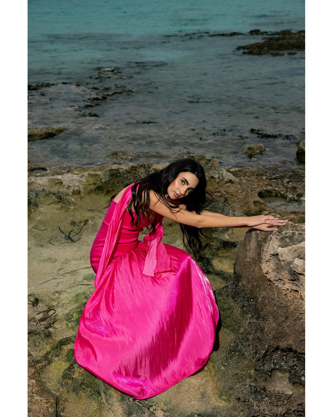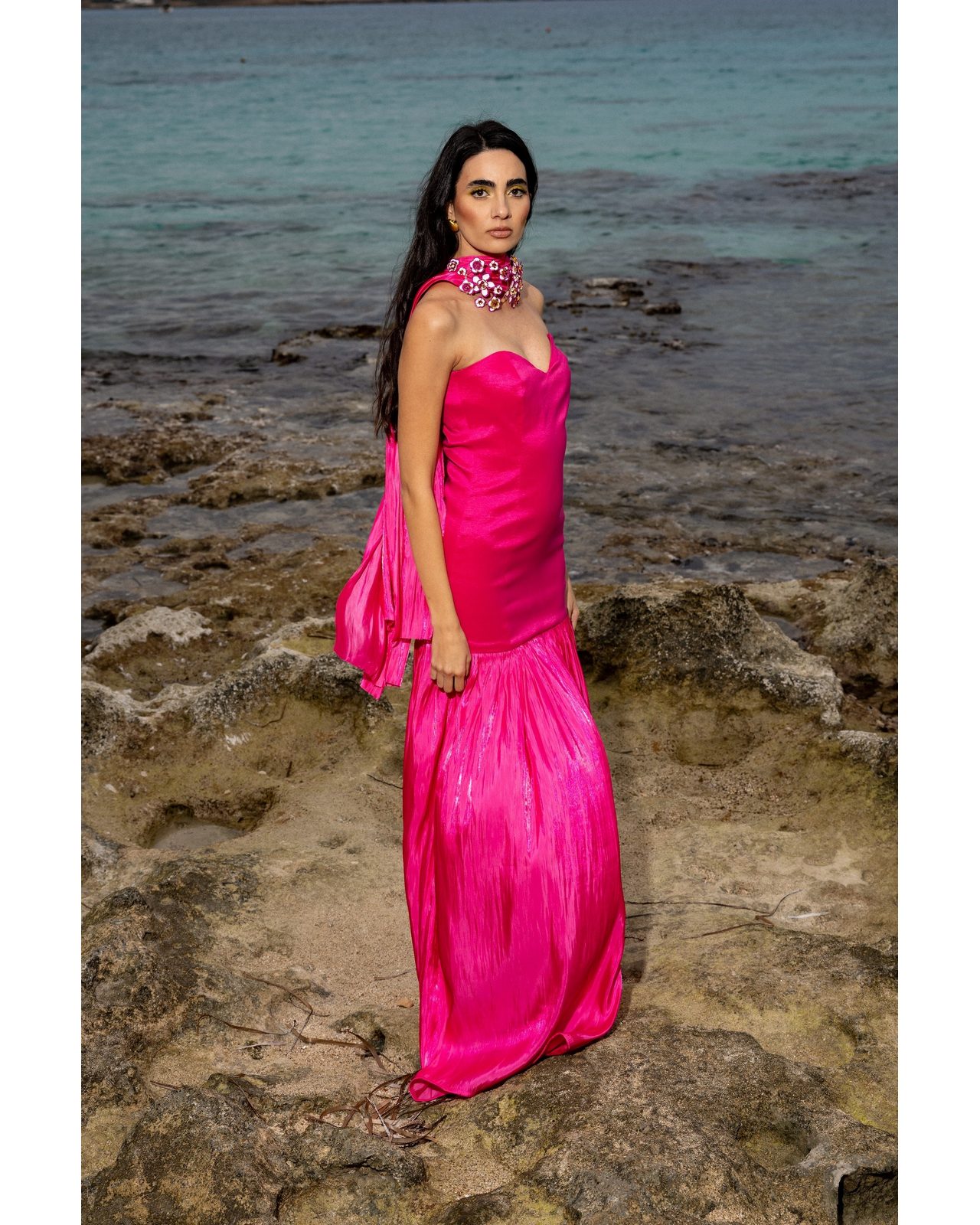 Μακρύ φόρεμα φούξια ,κατασκευασμένο από πολυτελές σατέν πού λαμπυρίζει με κάθε κίνηση.