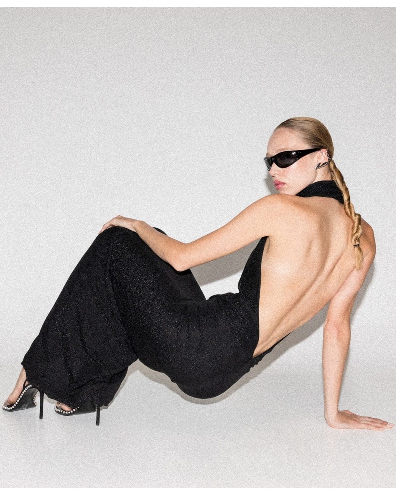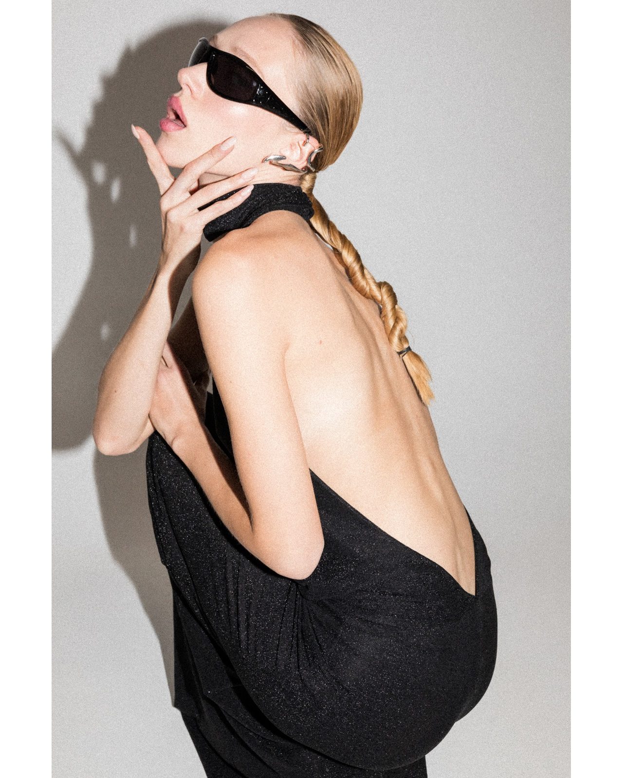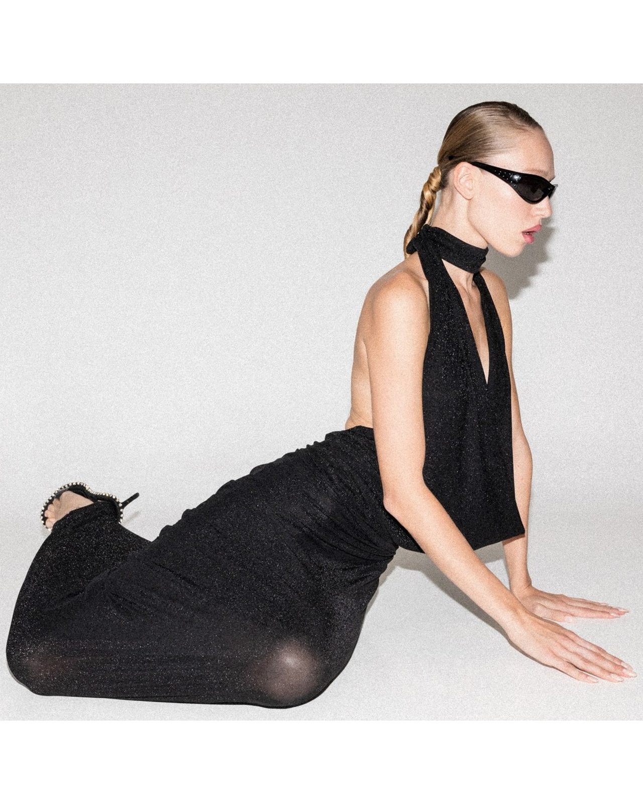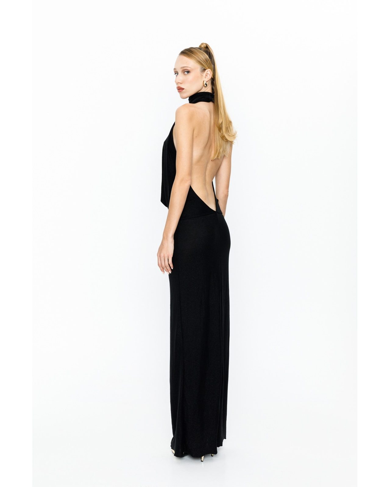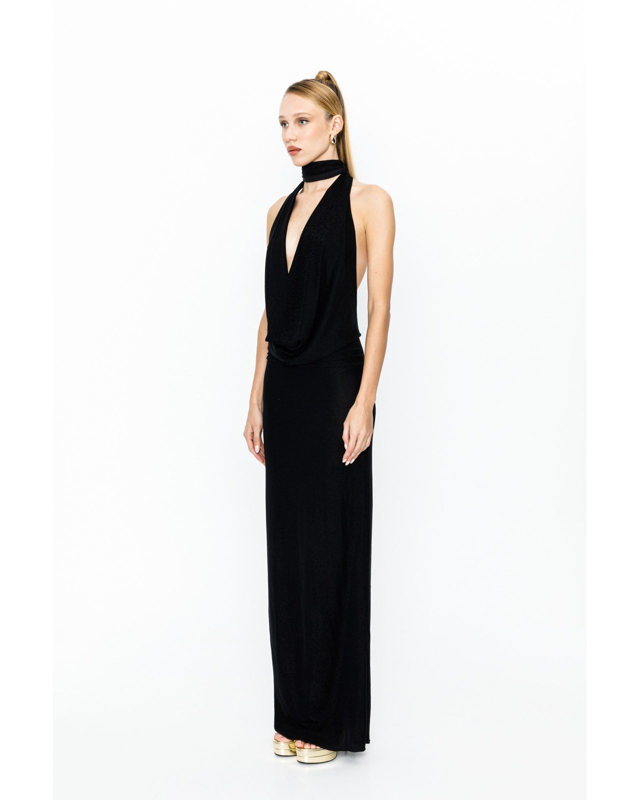 Coco lurex μακρύ μαύρο φόρεμα εξώπλατο με μεγάλο ντεκολτέ και choker στην λαιμόκοψη .