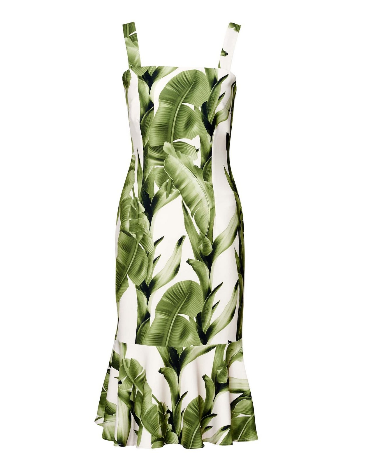 Κρέμ μίντι φόρεμα σε στενή γραμμή με πράσινη στάμπα φοίνικα και βολάν στο στρίφωμα.