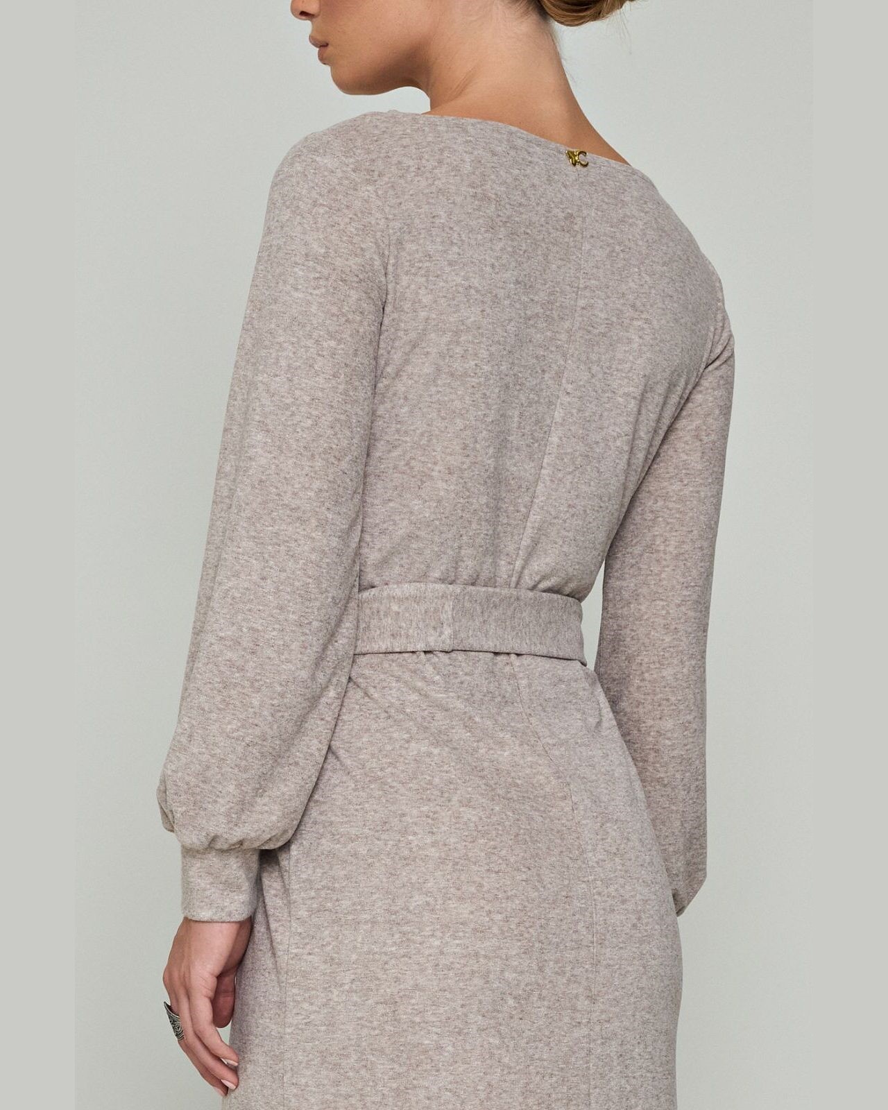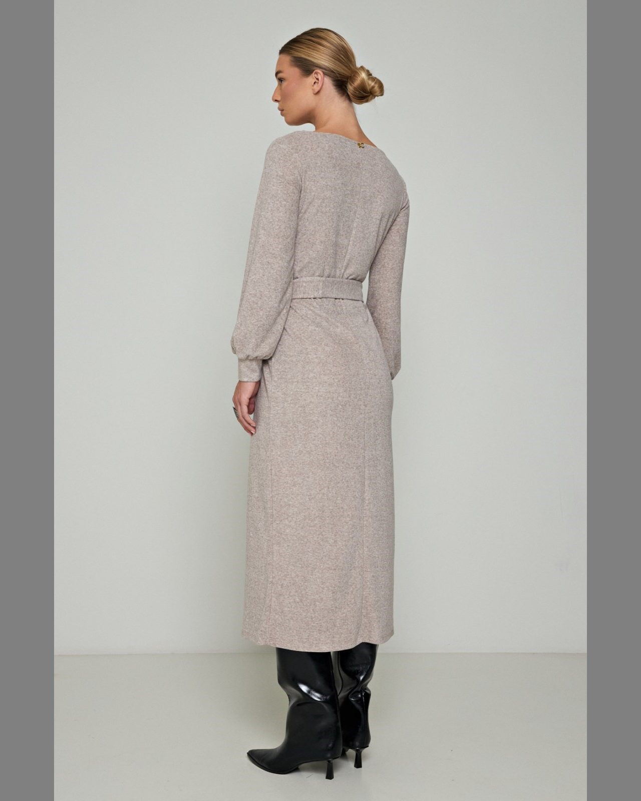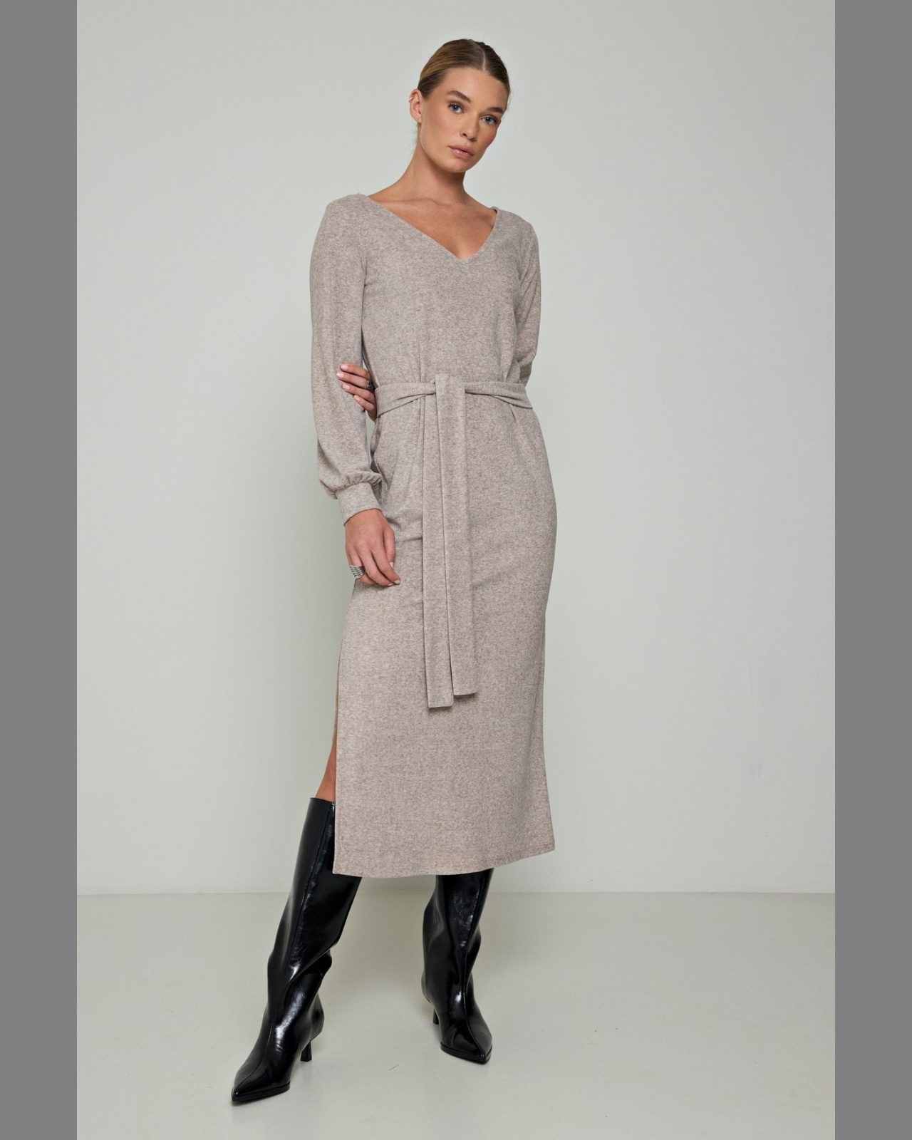 Φόρεμα πλεκτό με ζώνη σε άνετη γραμμή με λαιμόκοψη V και μακριά μανίκια με μανσέτα.