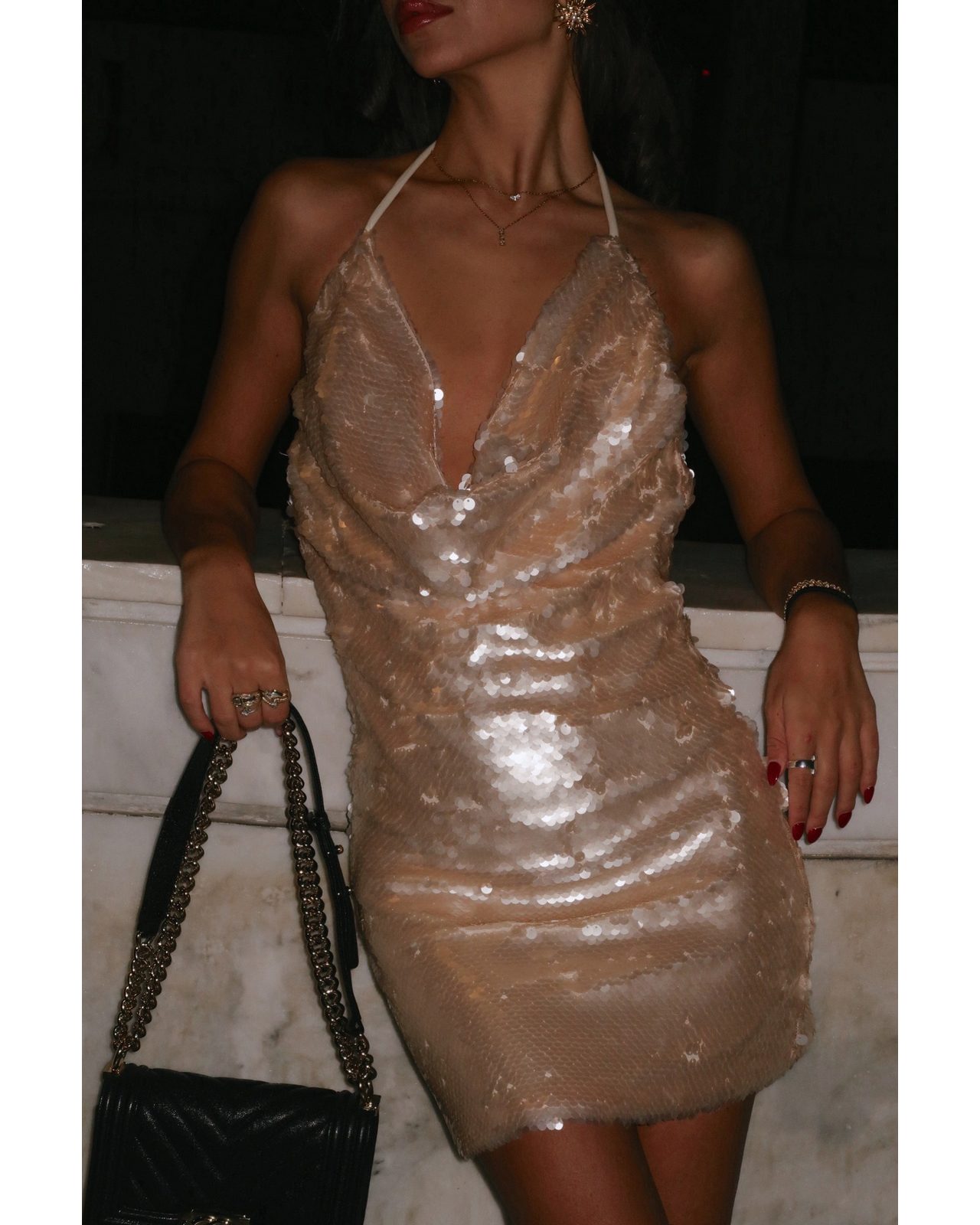 Gia sequin μίνι ivory , εξώπλατο φόρεμα με λεπτές τιράντες  και κρυφό φερμουάρ στο πλάι.