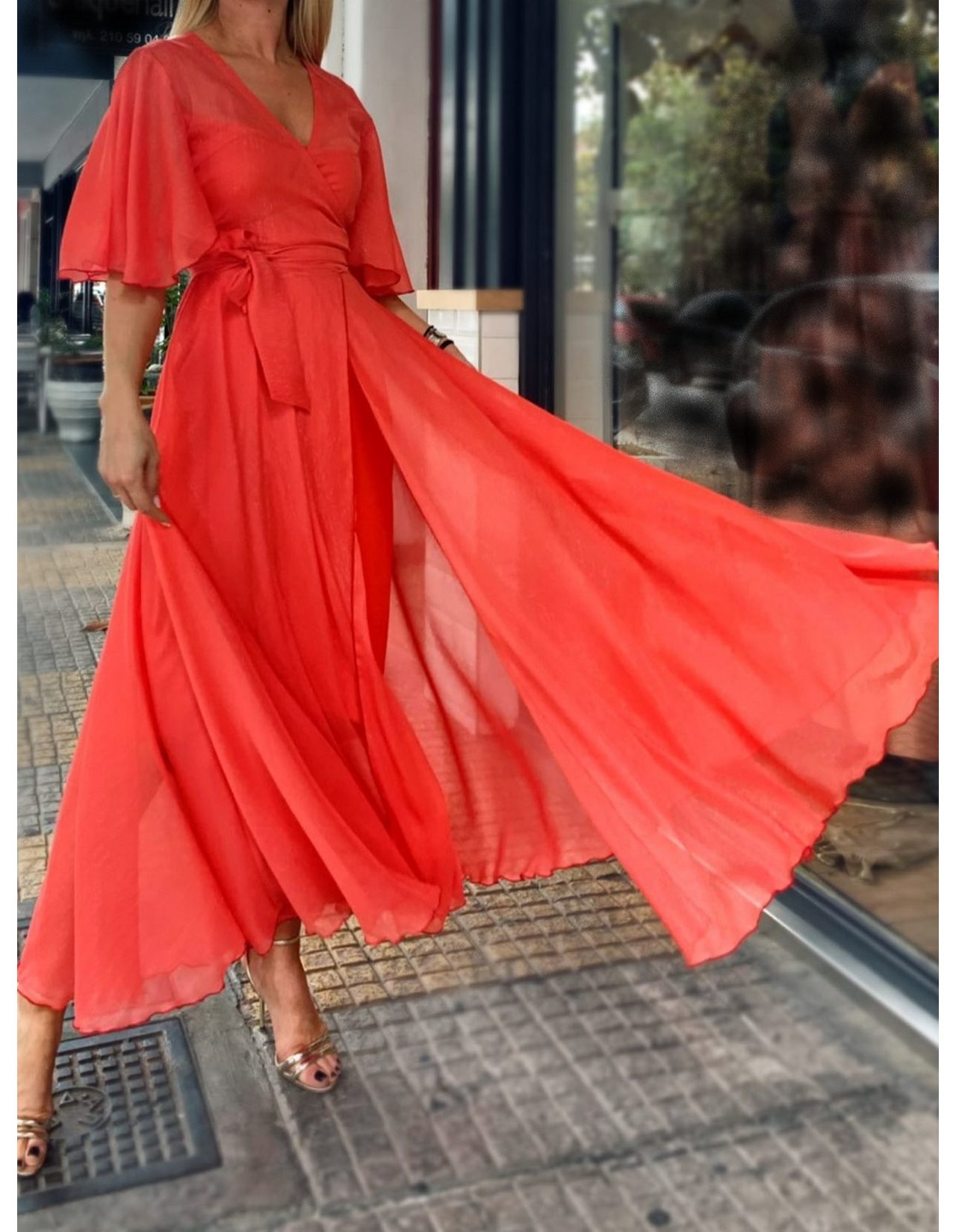Κρουαζέ μίντι φόρεμα με μεταλλική ίνα στην ύφανση,κοντό μανίκι-βολάν και ανεξάρτητο μισοφόρι στο ίδιο χρώμα.