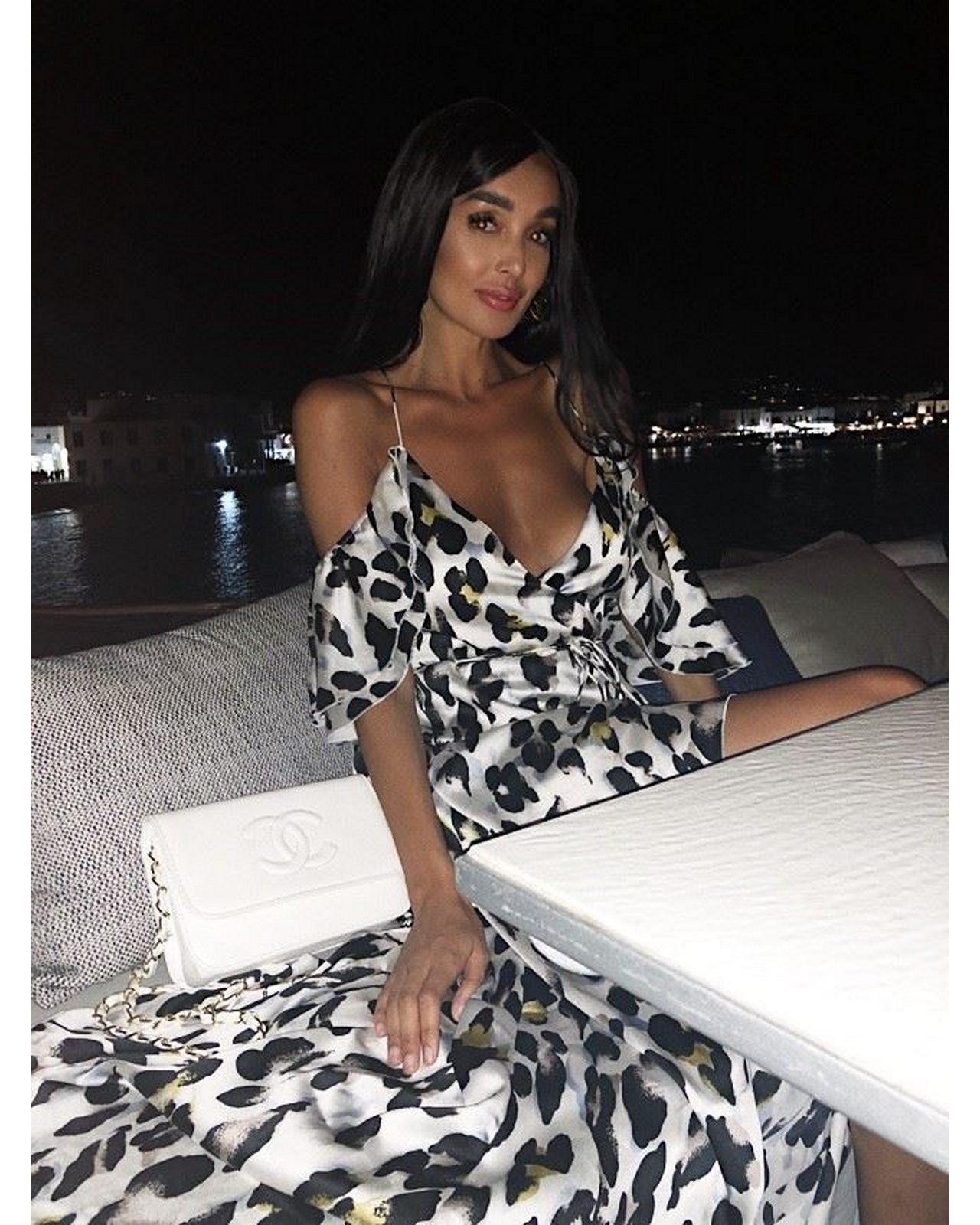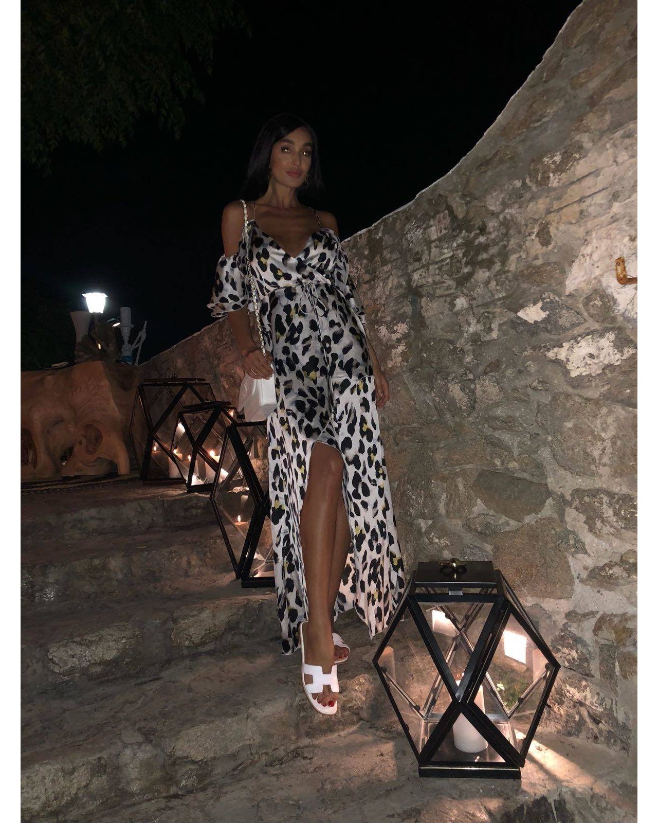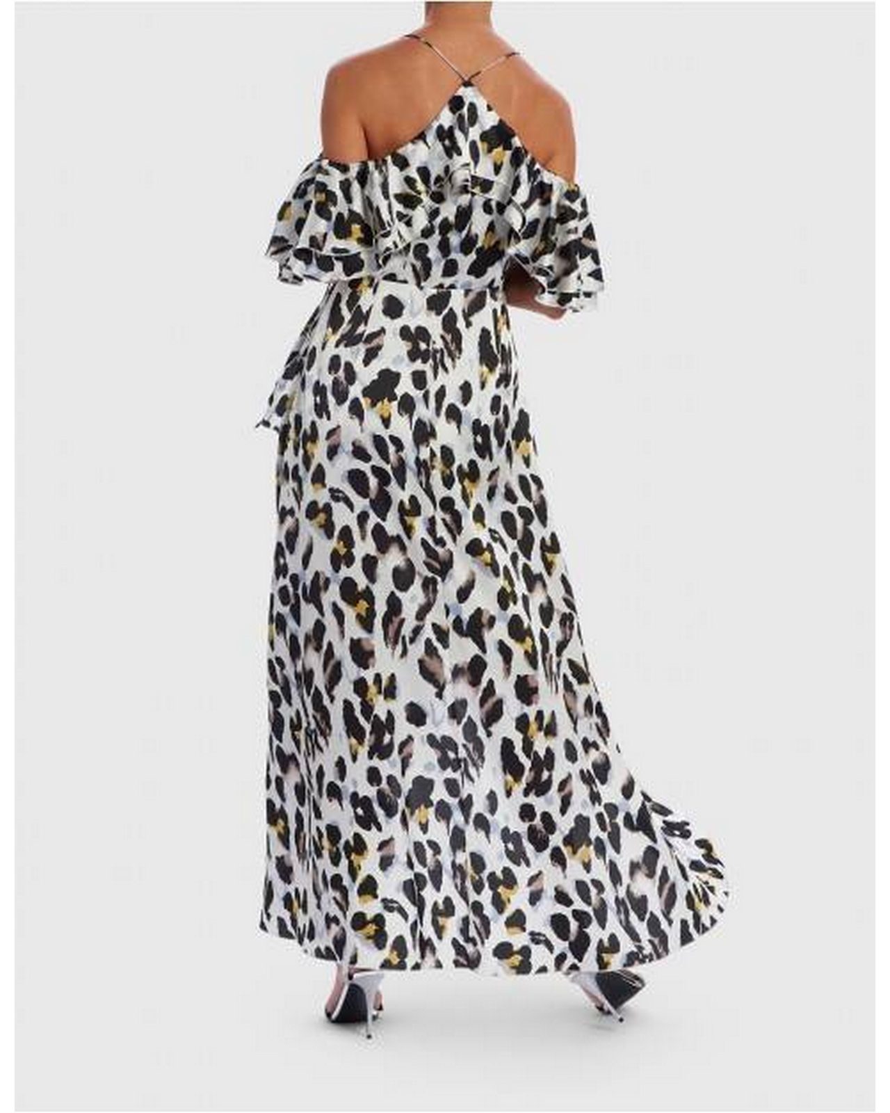 Μακρύ φόρεμα με λεπαρδαλέ τύπωμα,ασύμμετρο με άνοιγμα στο πόδι με βολάν και μανίκι -βολάν που αφήνει ακάλυπτους ώμους.