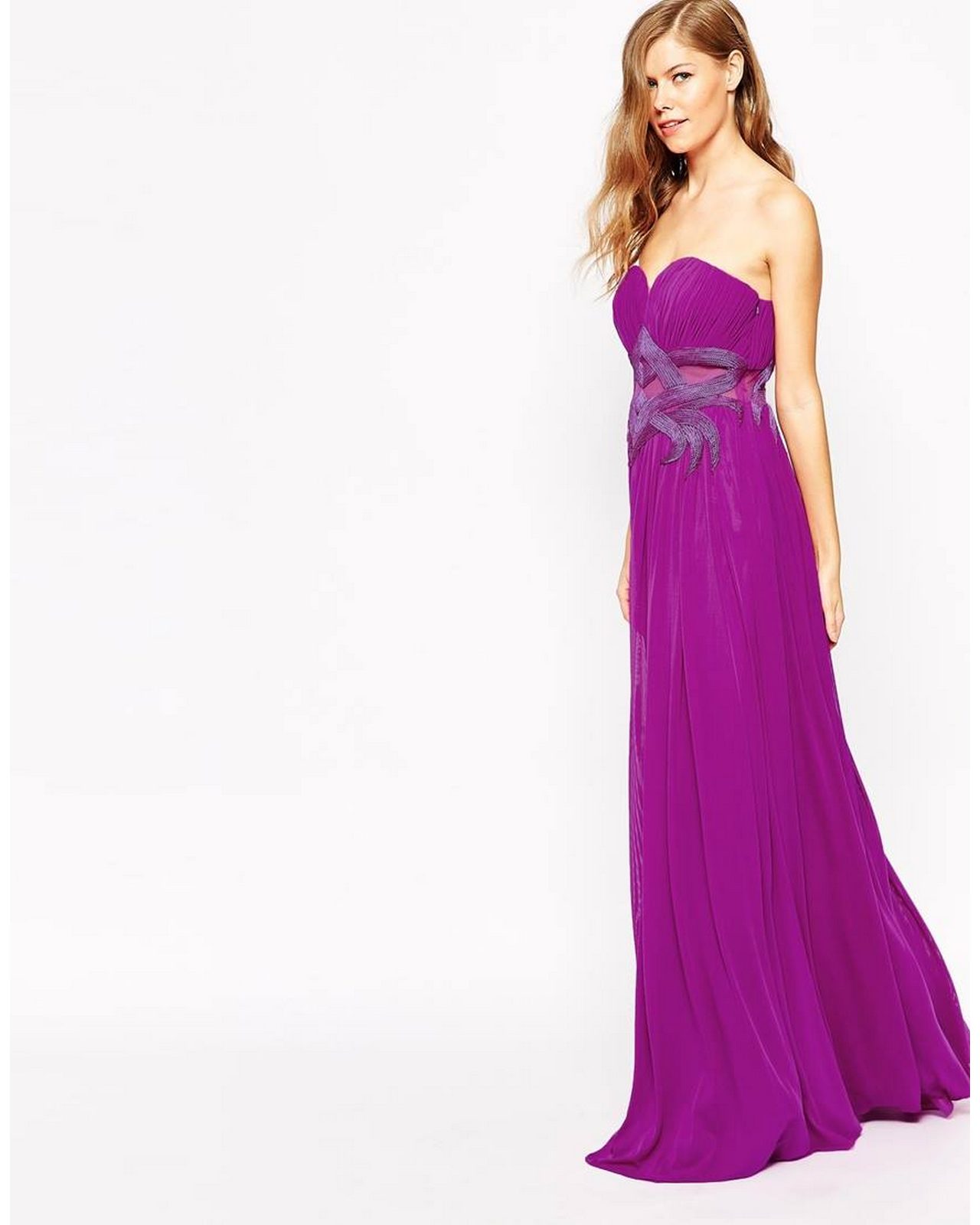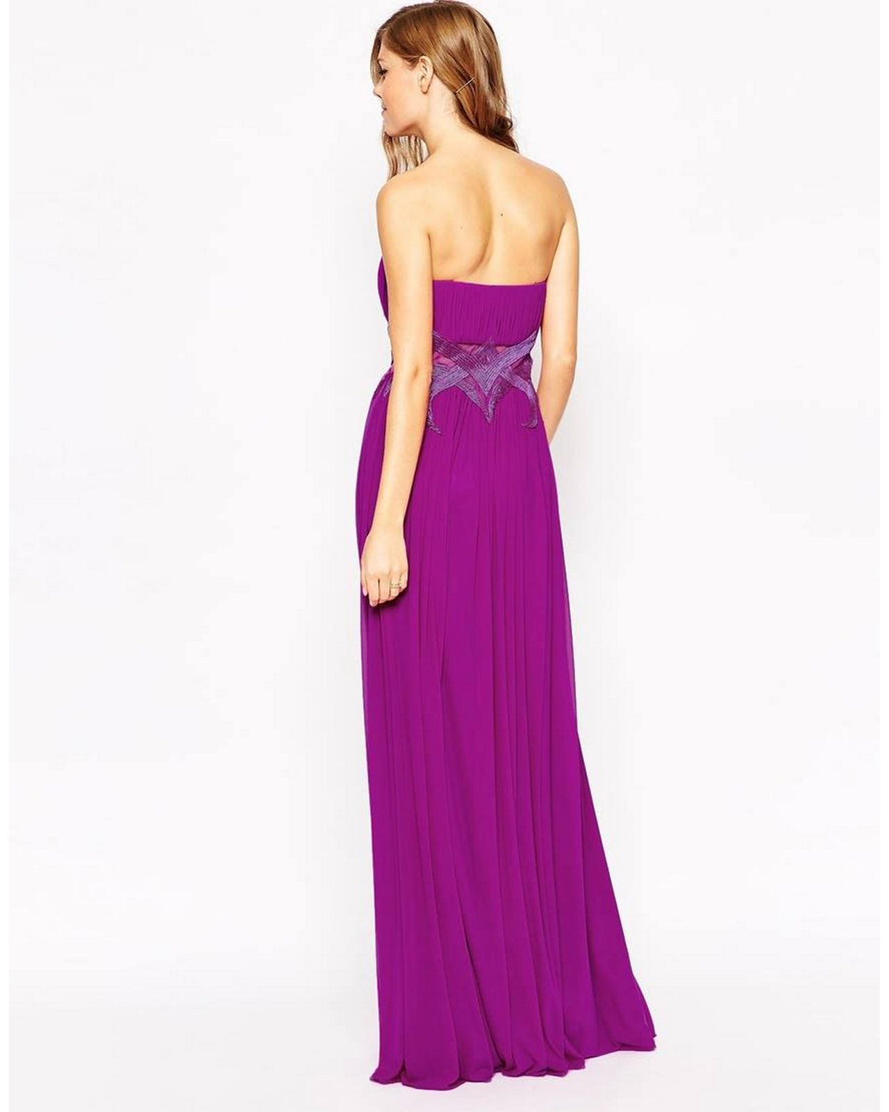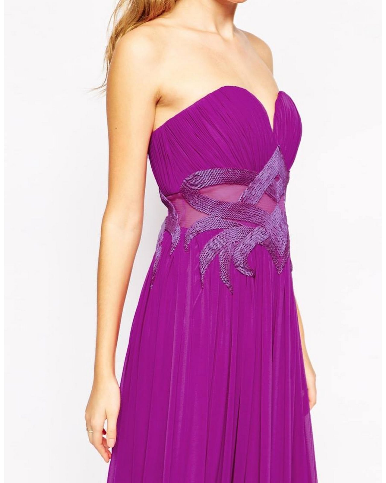 Μακρύ φόρεμα λιλά με διαφάνεια και κέντημα στην μέση.