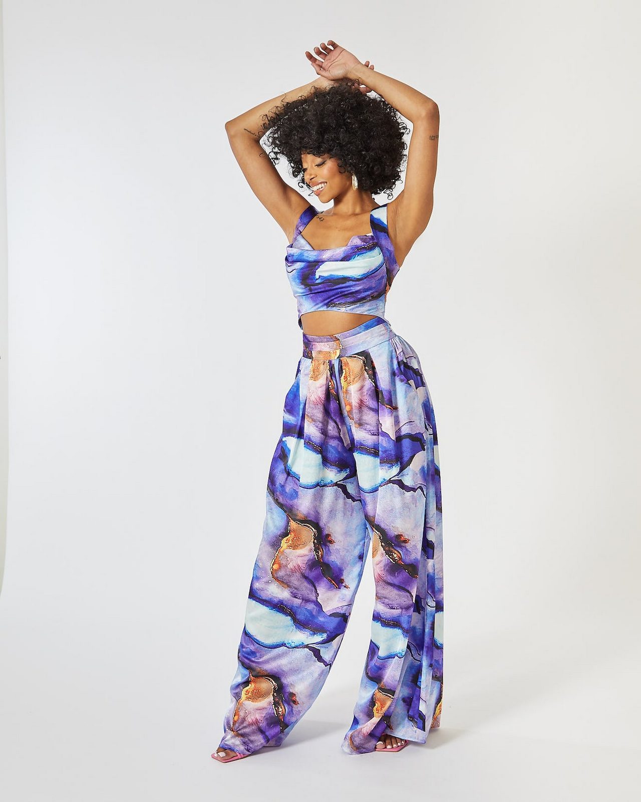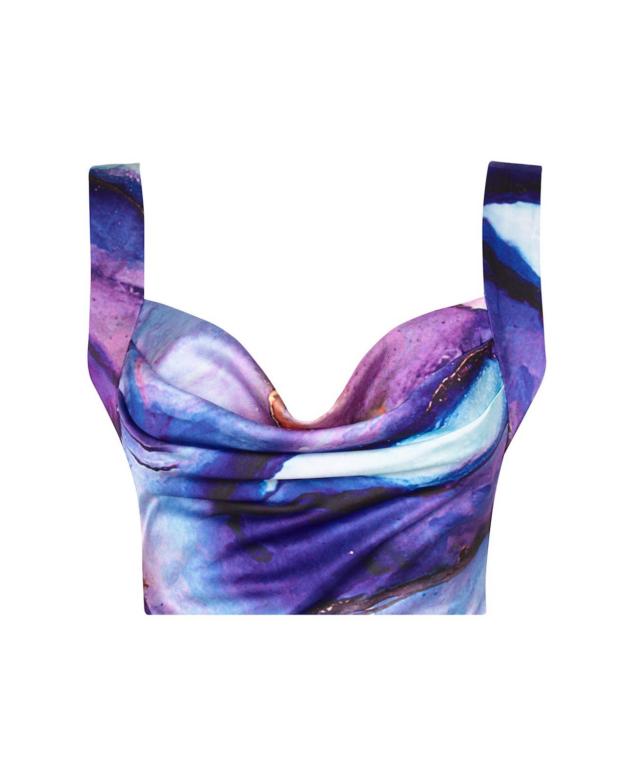 Μώβ τοπ με στάμπα μαρμάρου ,πολύχρωμο με κολακευτικό ντεκολτέ και καμπύλες φαρδιές τιράντες.