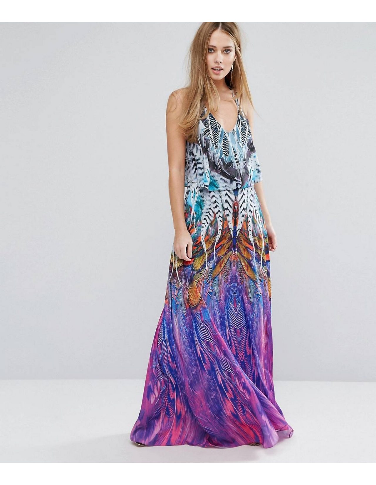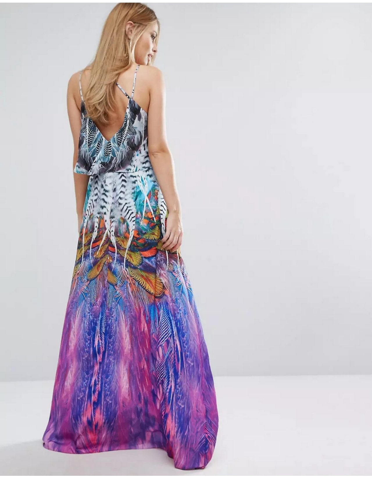 Πολύχρωμο μακρύ φόρεμα με τύπωμα από πολύχρωμα φτερά.
