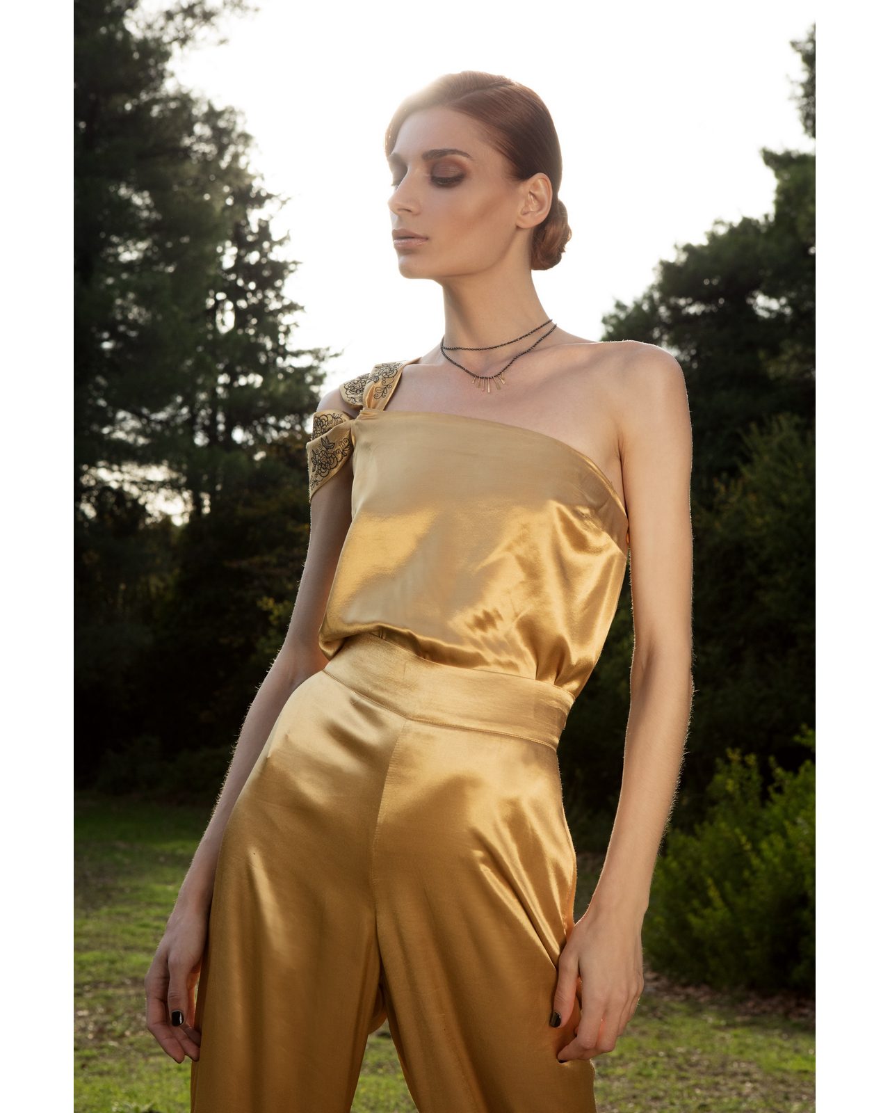 Σατέν navy-μπλέ τόπ,στηρίζεται στον ένα ώμο με λωρίδα υφάσματος πού καταλήγει στο μπράτσο.